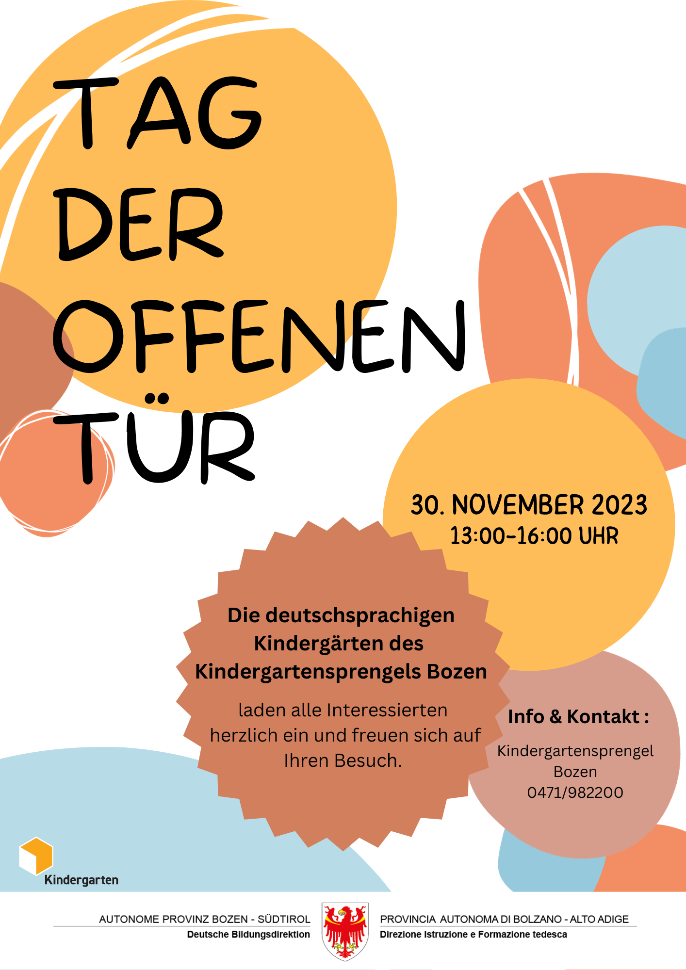 Le scuole dell’infanzia di lingua tedesca del distretto di Bolzano organizzano una giornata di porte aperte giovedì 30 novembre, dalle ore 13.00 alle ore 16.00. Genitori, famiglie, tutori e tutti gli interessati avranno la possibilità di visitare le 33 scuole dell’infanzia del distretto e di farsi un'idea del lavoro educativo.