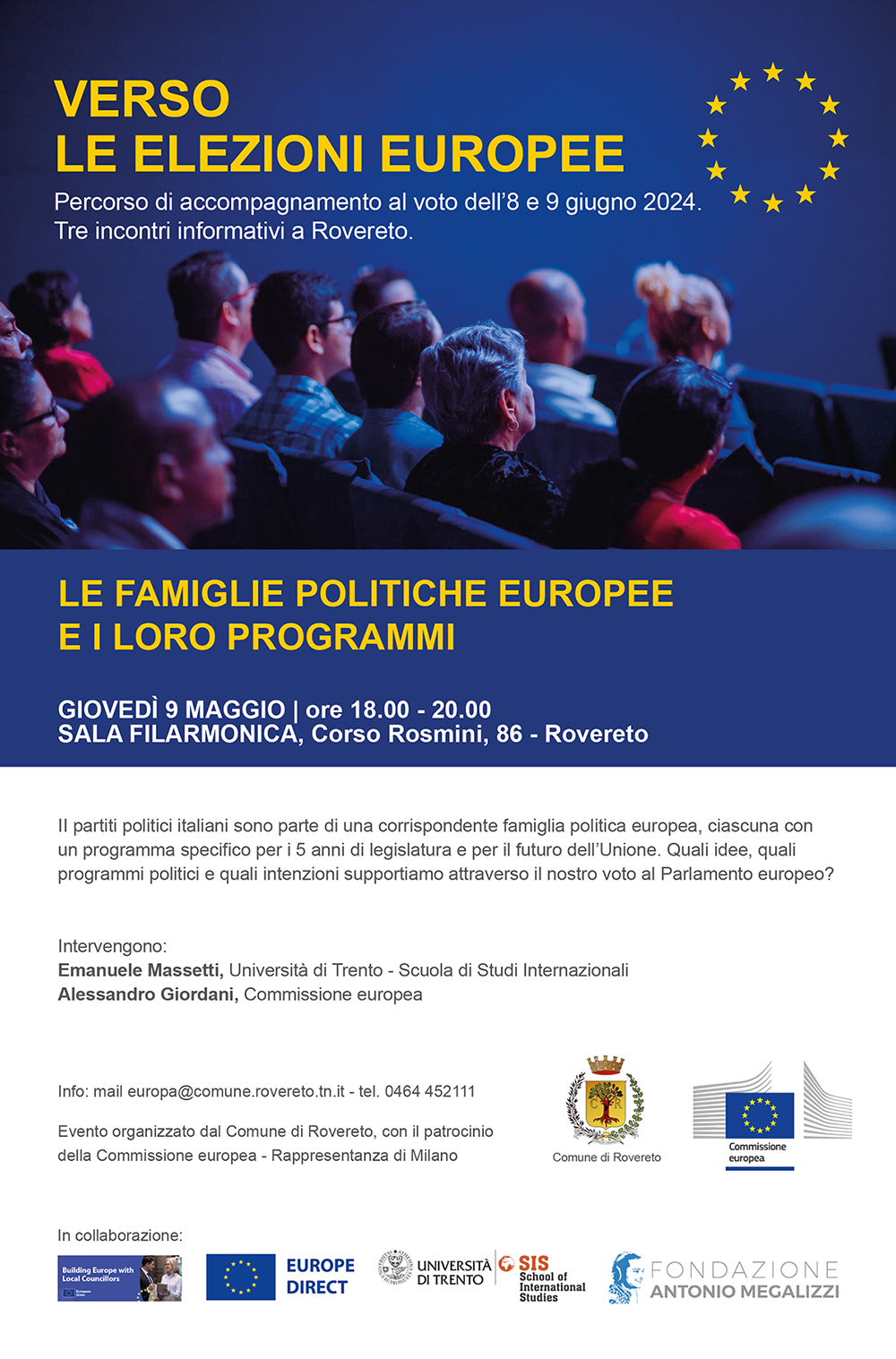 Quest'anno lo sportello Europe Direct, punto di contatto tra la cittadinanza e le istituzioni comunitarie, partecipa all'evento "Verso le elezioni europee", in programma a Rovereto il 9 maggio. La mattinata sarà dedicata ad attività per studenti: Europe Direct accompagnerà quattro classi dell'Istituto Tecnico Economico in lingua tedesca “Franz Kafka”. Alla sera, dalle 18 alle 20, presso la Sala Filarmonica di Rovereto, si terrà una presentazione al pubblico sul tema "Le famiglie politiche europee e i loro programmi" (evento in italiano).