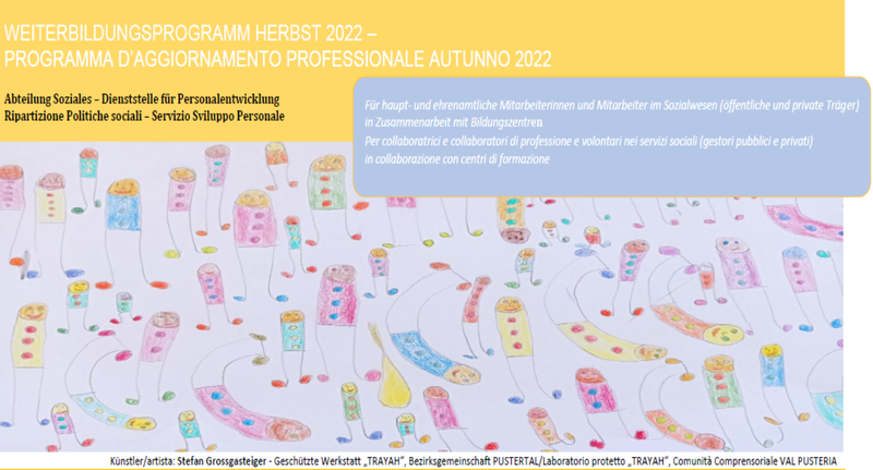 Insieme alle organizzazioni partner, il Servizio sviluppo del personale del Dipartimento provinciale alle politiche sociali ha creato un programma completo di formazione ulteriore per il settore sociale. Si rivolge ai dipendenti a tempo pieno e volontari del settore sociale nonché ai cittadini interessati. Per alcuni dei corsi di formazione vengono rilasciati anche dei crediti formativi che certificano il percorso effettuato.