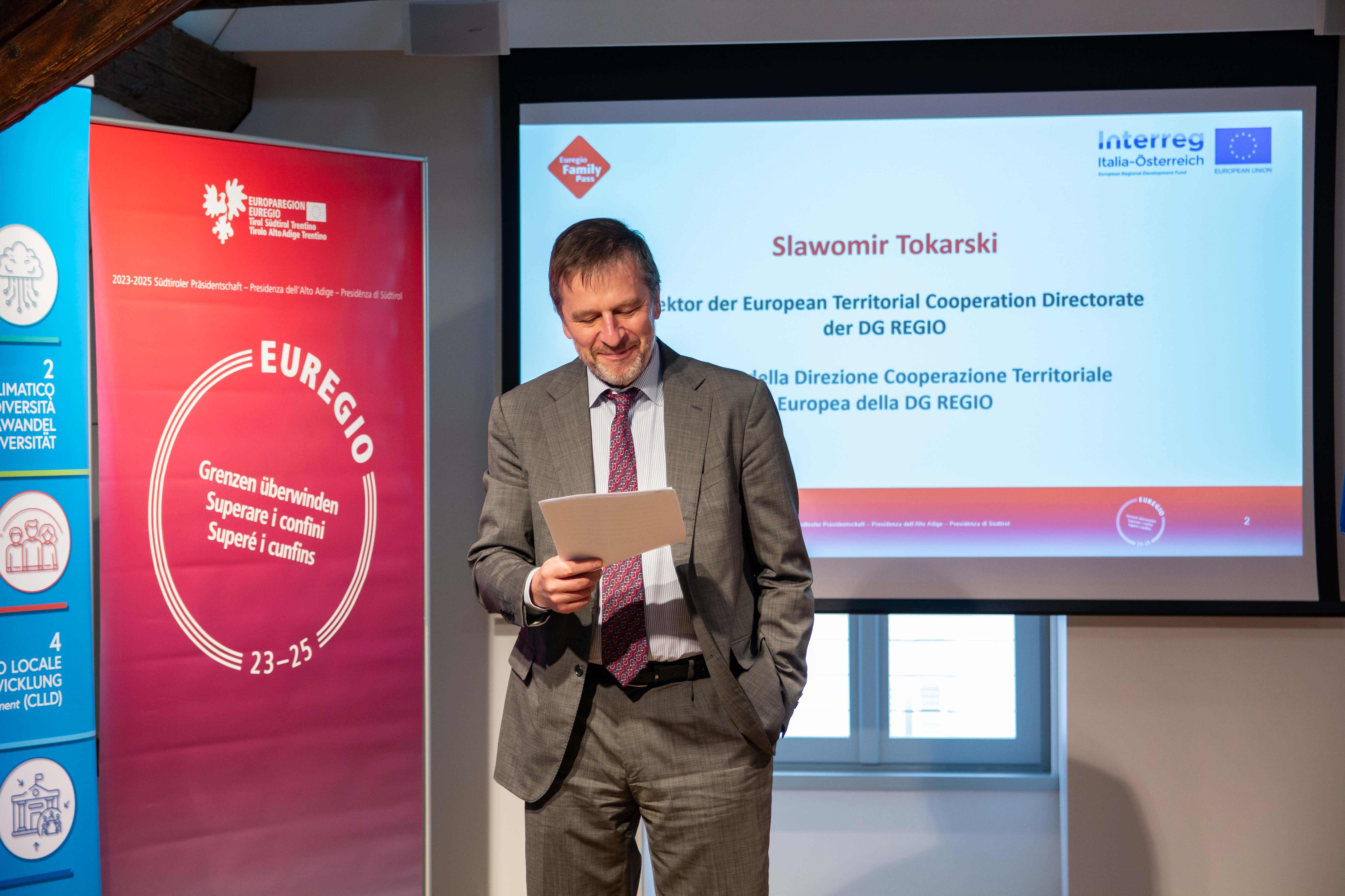 Dopo il pomeriggio dedicato alle famiglie, all'ultimo piano si è svolto un incontro di networking con personalità di alto livello dell'UE e della politica locale. Tra gli altri, il direttore della European Territorial Cooperation Directorate della DG Regio (Direzione Generale Politica Regionale e Urbana), Slawomir Tokarski, ha raggiunto Bolzano appositamente per celebrare il successo dell'EuregioFamilyPass quale carta vantaggi per l'intera Euregio e per presentare per la prima volta la campagna di comunicazione con il video di accompagnamento, oltre al progetto nel complesso. al progetto nel complesso. “L'EuregioFamilyPass è un'ottima iniziativa che invita le famiglie con bambini piccoli a spostarsi oltre i confini dell’Euregio Tirolo-Alto Adige-Trentino e a scoprire la regione di confine con tutti i suoi tesori culturali. Per la sua eccellenza, l'anno scorso abbiamo premiato l'iniziativa con un RegioStars nella categoria "Un'Europa più vicina ai cittadini". Nei territori di confine, l'Europa è tangibile per i cittadini ogni giorno e sono lieto di essere qui oggi per sperimentare questo spirito unico", ha sottolineato Tokarski. Martha Gärber, direttrice della Ripartizione Europa della Provincia autonoma di Bolzano, ha parlato delle numerose attività dell'Euregio nel Programma Interreg.