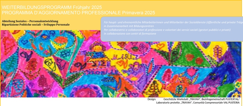 Il programma è disponibile sul portale di aggiornamento professionale. Le iscrizioni ai rispettivi corsi possono essere effettuate direttamente tramite gli enti di formazione elencati. L'immagine di copertina del programma di quest'anno è stata disegnata dal laboratorio protetto Trayah della Comunità comprensoriale Val Pusteria. Informazioni sono disponibili anche presso l'Ufficio Persone con disabilità (mail: ada.pirozzi@provincia.bz.it o telefonicamente al numero 0471 418226).