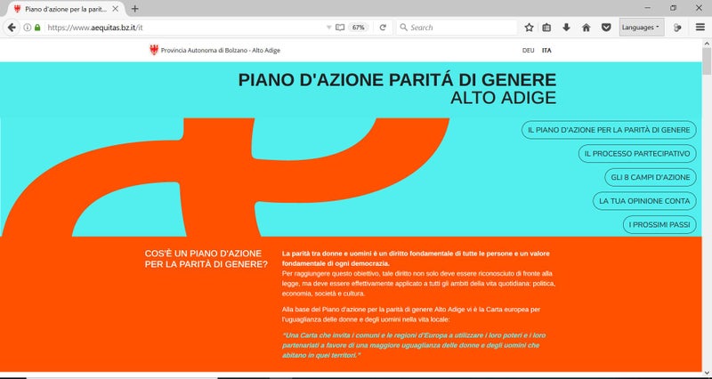 - Nella foto la Homepage del sito Æquitas che va illustrare cosa prevede il Piano d'azione per la parità di genere in Alto Adige (Foto: ASP) » [IMG 192 kB]