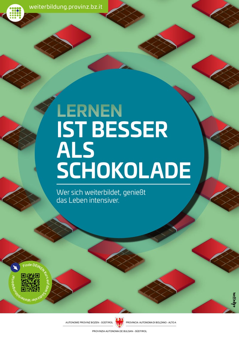Nel 2018, l'Assemblea generale delle Nazioni Unite ha proclamato il 24 gennaio Giornata internazionale dell'Educazione. L'obiettivo di questa ricorrenza è quello di richiamare l'attenzione sul ruolo chiave dell'istruzione nella realizzazione di società inclusive, eque e sostenibili. L'Ufficio provinciale Formazione continua, in concomitanza con questa data, promuove una nuova campagna di sensibilizzazione. L'iniziativa è stata ideata con l’intento di diffondere l'ampia offerta di programmi svolti in Alto Adige e, all'insegna del motto "Imparare è meglio del cioccolato", per dimostrare che imparare può anche essere molto divertente.