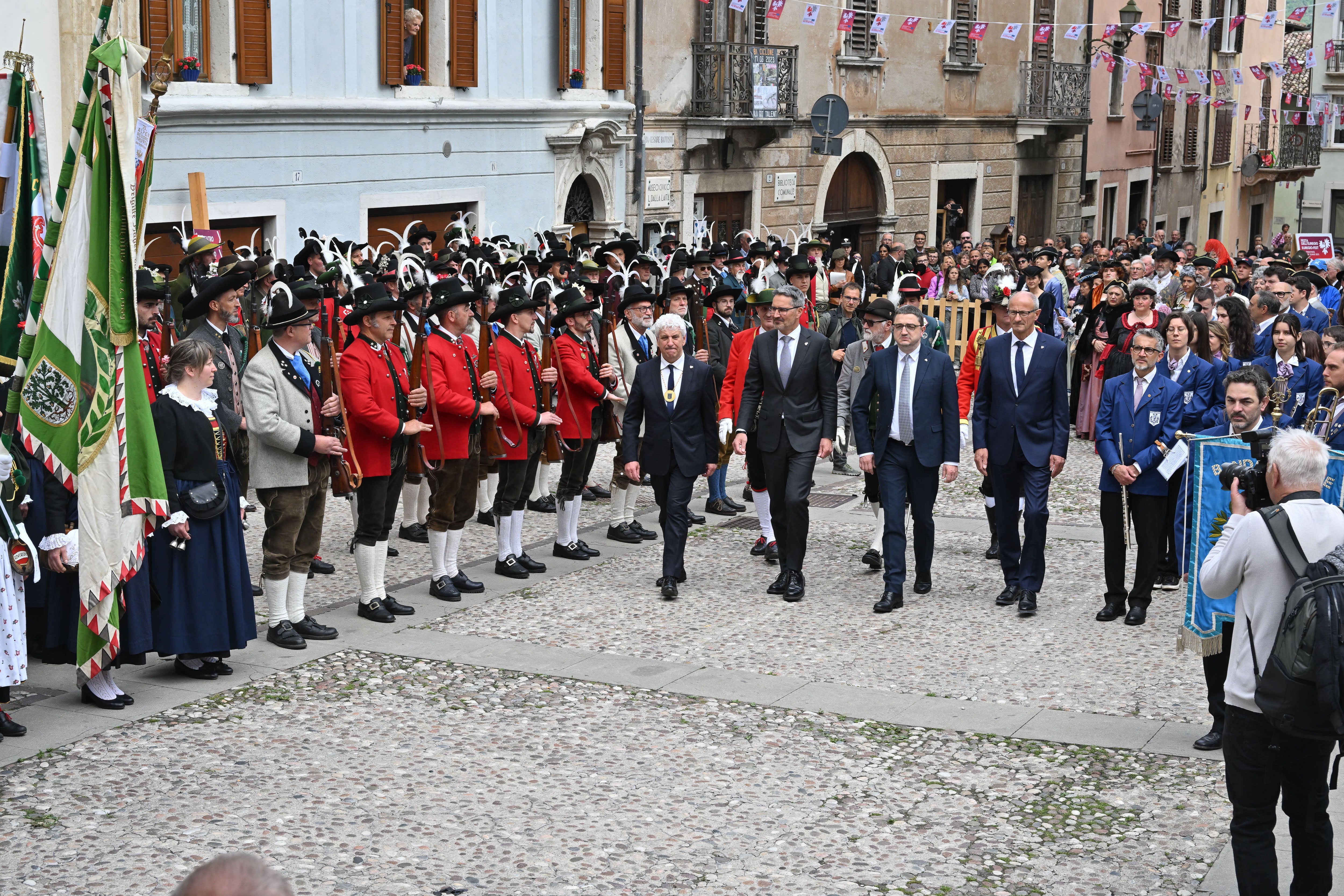 - I tre governatori sfilano in strada durante la giornata di celebrazioni dell'Euregio. (Foto: Ufficio Stampa Provincia di Trento/Corrado Poli) » [IMG 3 MB]