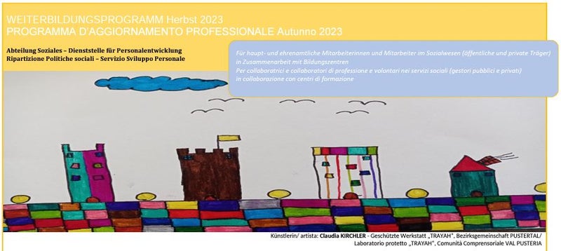 Il programma autunnale di aggiornamento professionale della Ripartizione Politiche sociali - Servizio Sviluppo Personale è ampio e offre spazio a interessi diversi: dalla cura delle persone con ferite croniche alla "Spiritual care", fino al testamento biologico ed alla leadership del personale. Sono numerosi i programmi offerti dal Servizio Sviluppo Personale della Ripartizione Politiche sociali in collaborazione con i Centri di formazione "Haus der Familie" (Casa della Famiglia) e "Lichtenburg" e con i due Istituti provinciali per le professioni sociali "Hannah Arendt" ed "Emmanuel Lèvinas". Il programma è rivolto ai lavoratori a tempo pieno, ai volontari del settore sociale e ai cittadini interessati.