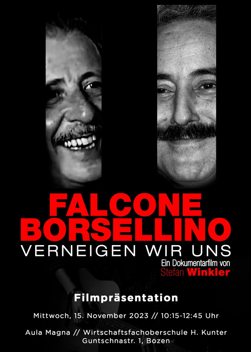 Il film-documentario "Falcone Borsellino - verneigen wir uns" (inchiniamoci) offre uno sguardo sulla vita dei personaggi Falcone e Borsellino e sul tema della mafia e della criminalità organizzata e del loro impatto sociale. Il film è stato prodotto dal cantautore e regista bolzanino Stefan Winkler. La proiezione del film intende incoraggiare gli studenti delle scuole superiori tedesche, italiane e ladine ad approfondire l'argomento. Stefan Winkler parlerà della realizzazione e del background del film e risponderà alle domande.